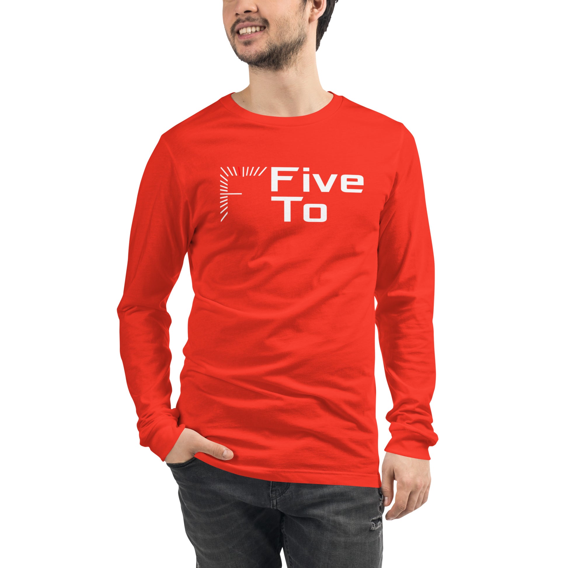 Our stylish FiveTo logo on a long sleeve T-Shirt. Ideal for the days when it's too chilly for bare arms or complying with some kind of anti short sleeve dress code. Help us become an international sensation in tiny increments. As this is unlikely to occur any time soon, you can be stylishly individual for the foreseeable future.